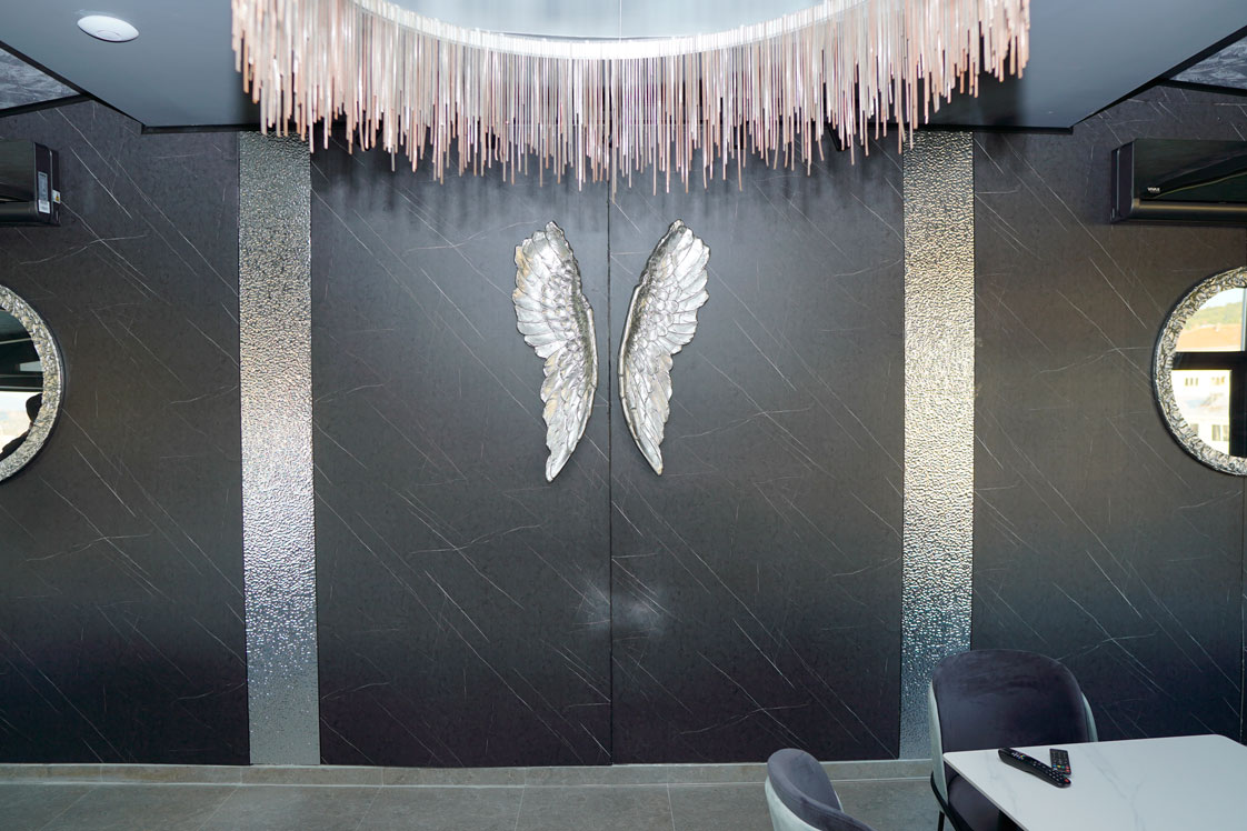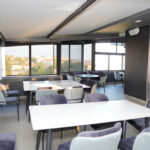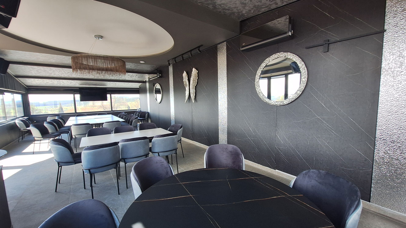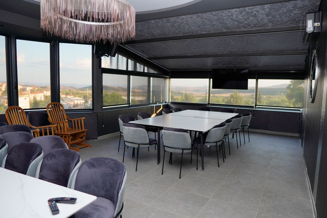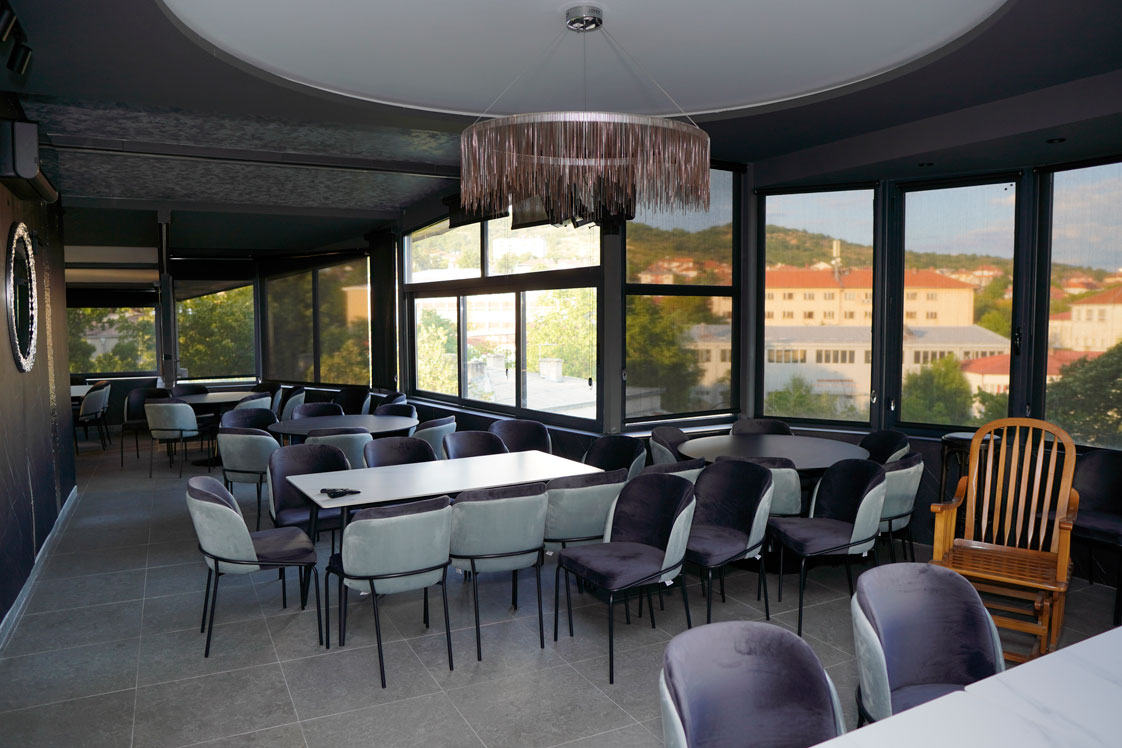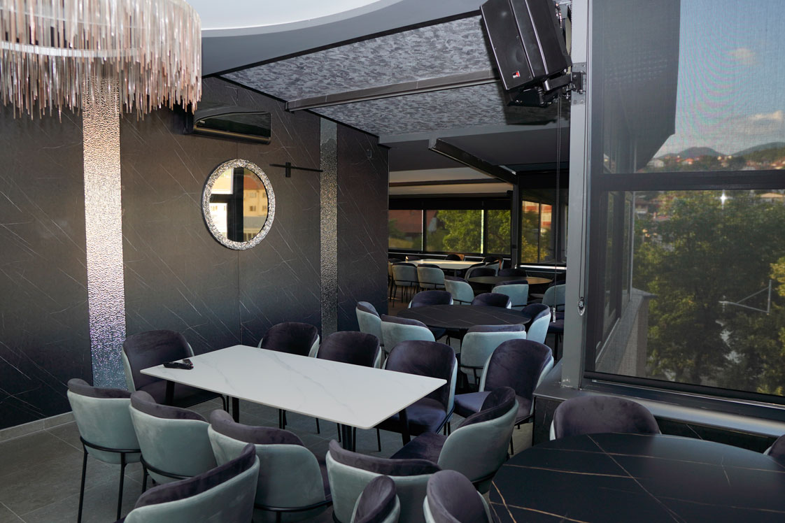 Просторот е современо уреден и внимателно осмислен за да обезбеди удобност и пријатен амбиент, со прекрасен панорамски поглед на градот кој му дава дополнителна вредност на секој настан. Rooftop-от овозможува опуштена, но елегантна атмосфера, погодна за дневни и вечерни активности.